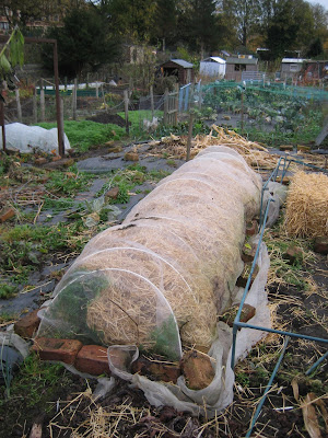 It has been a good year for carrots. So much so that, despite chomping away on them as fast as rabbits, half the crop is still in the ground. So rather than moving the mountain I have revived an old idea with a new twist. Harvested root crops in the past have been stored in clamps: put in a pit, covered with straw and then earth, to protect from frost. Having the thrip netting in place already it occurred to me that, duvet style, the straw could float above the undug carrots for warmth. It is not going to blow away because the net is retaining it.
