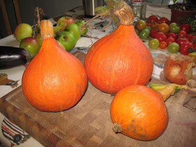 Now that the leaves are dying back the pumpkin patch is revealing this year's crop. Special mention for the butternut squash (Hunter). This one weighs in at over 4 kilos. There is twin awaiting harvest but there is only so much carrying power between the allotment and home.